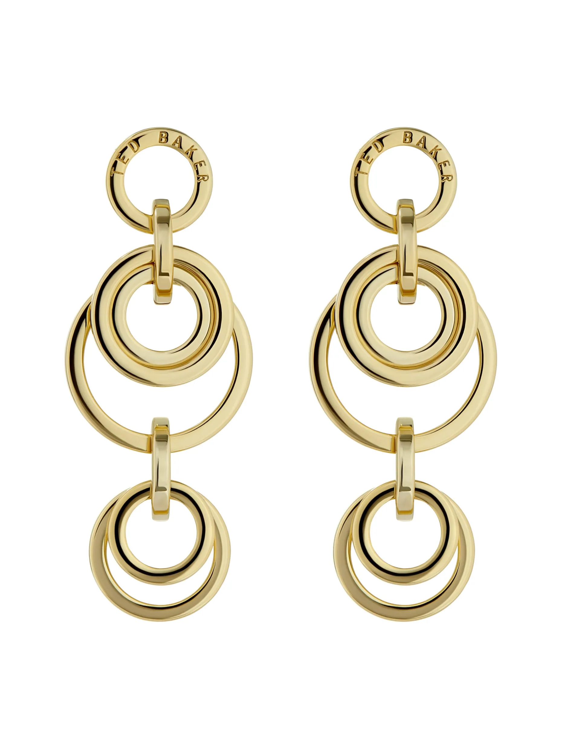 Create circles of influence with Ted Baker’s Huliet Muti Hoop Drop Earrings. A series of metal bands hang gracefully, adding playful movement to your style. Finished in gold-tone plating. Suitable for pierced earrings only. Comes in a Ted Baker branded gift box.